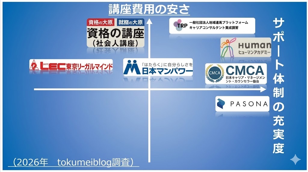 - キャリアコンサルタント5つの養成講座の比較表